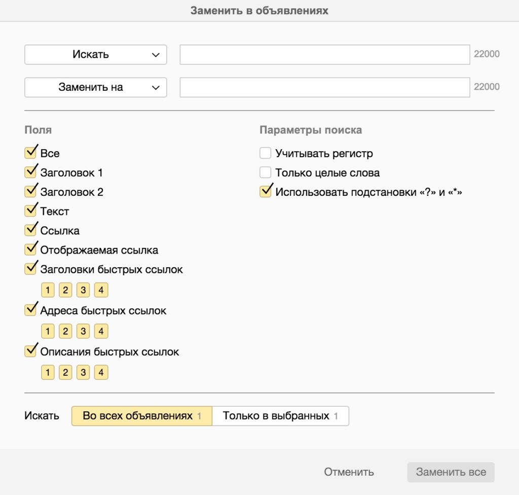 Пожалуй, одна из самых впечатляющих функций Директ Коммандера — это поиск и замена текста в любых элементах рекламы.