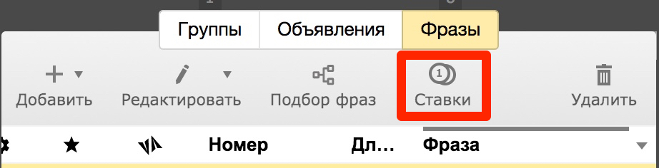 В Коммандере удобно назначать и собственные ставки для ключевых слов. Выделите ключевики, по которым хотите изменить цену клика, и нажмите кнопку «Ставки» в верхнем тулбаре панели.