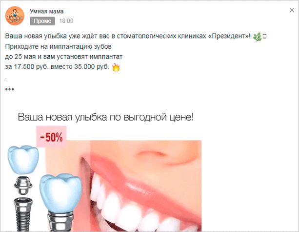 Наиболее распространенный способ рекламы – это подготовка и публикация рекламного поста в ленте. Пример на скриншоте.