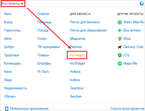 В самом верху страницы социальной сети нажмите на надпись “Все проекты” и выберите “myTarget”.