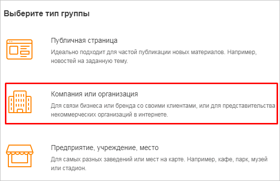 В новом окне выберите подходящий под ваши цели вариант сообщества. Например, мы делаем страницу для интернет-магазина детских развивающих игрушек, значит, нажимаем на надпись “Компания или организация”.