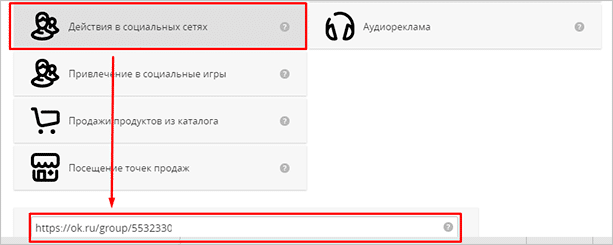 Кликаем по цели “Действия в социальных сетях” и копируем адрес группы.