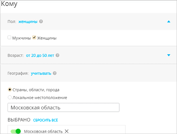 - Страна, область, город или локальное место на карте, которое посещали люди, то есть геолокация. Если вы ведете бизнес в определенном регионе, то нет смысла показывать рекламу по всей стране.