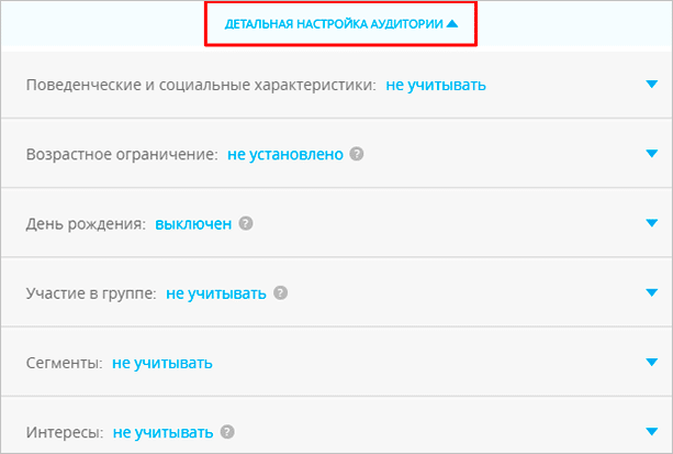 После этого приступаем непосредственно к таргетингу. Нам доступны такие настройки.