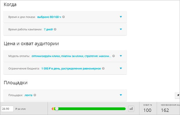 - Стоимость одного клика. Обратите внимание, что при минимальной стоимости охват будет неполным. Отрегулируйте ставку так, чтобы получать лучший результат.