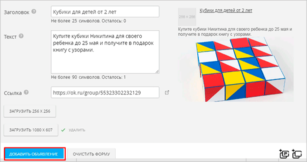 Обратите внимание на минимальный размер картинок. Для ленты он составляет 1 080 × 607 px, для блока рекламы – 256 × 256 px. После всех настроек нажмите “Создать кампанию”.