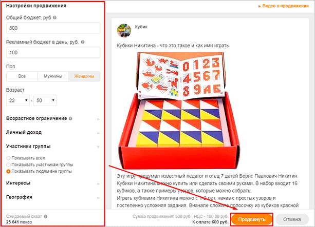 Теперь настройте аудиторию для показа. Здесь доступно меньше условий для таргетинга, но все же, правильно подобрав интересы и географию, можно выйти на потенциальных подписчиков. После настройки нажмите оранжевую кнопку. Обратите внимание, что выделенный бюджет увеличится на сумму НДС.