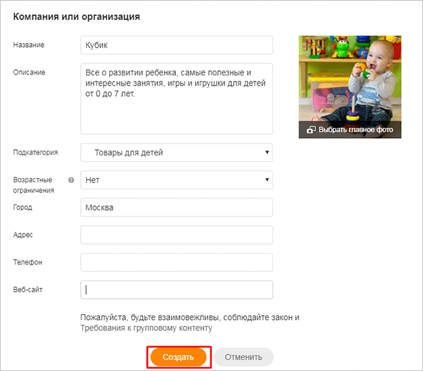 Теперь нужно заполнить небольшую форму для оформления группы и нажать кнопку “Создать”.