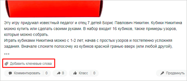 Для продвижения важно указать ключевые слова, по которым пользователи социальной сети смогут вас найти.