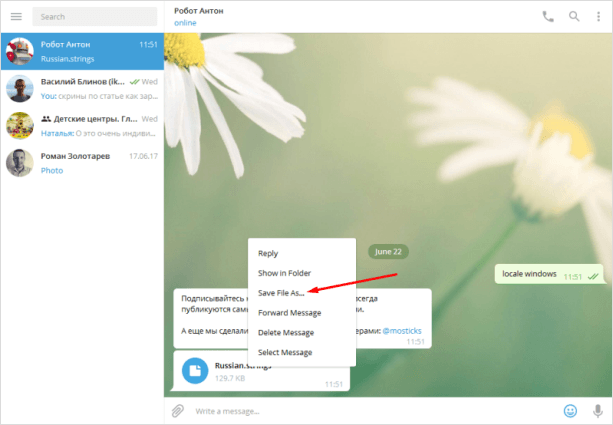 Шаг 3. Когда бот пришлёт файл, кликните по нему правой кнопкой мыши и выберите «Save File As…», то есть задайте место его сохранения на жёстком диске компьютера.