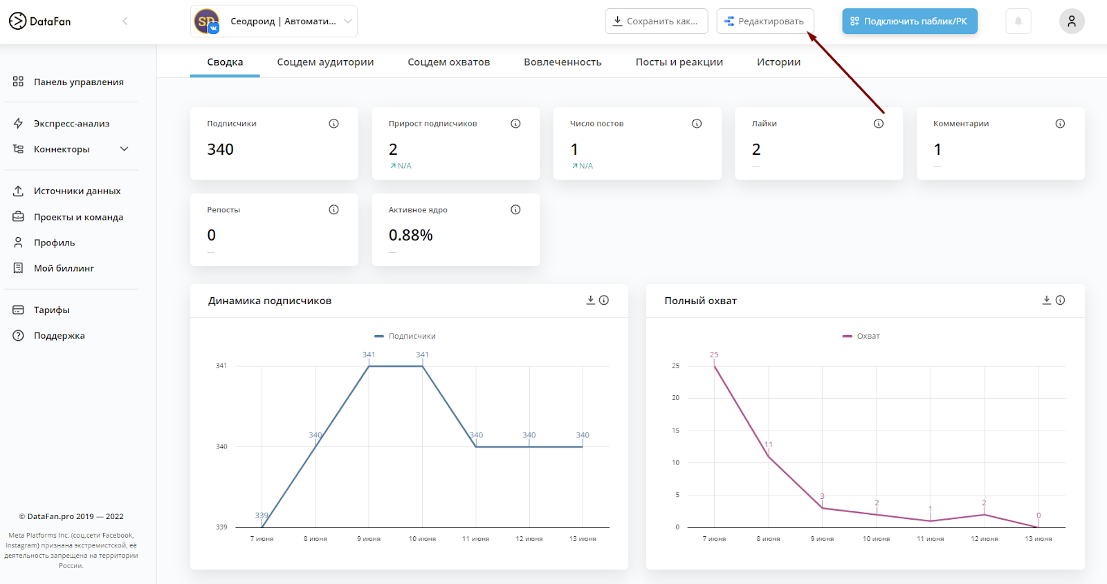 Как воспользоваться. По аналогии с предыдущем дашбордом, только в списке шаблонов выберите “Дашборд Instagram* от DataFan”.
