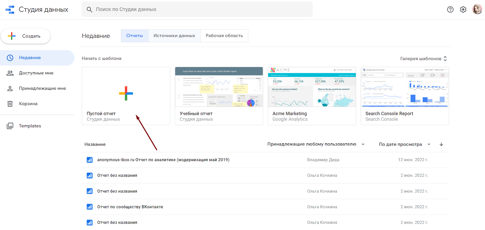 1. Подключаем источники данных. Для этого зайдите в Google Data Studio, авторизуйтесь под аккаунтом Google и кликните «Пустой отчет».