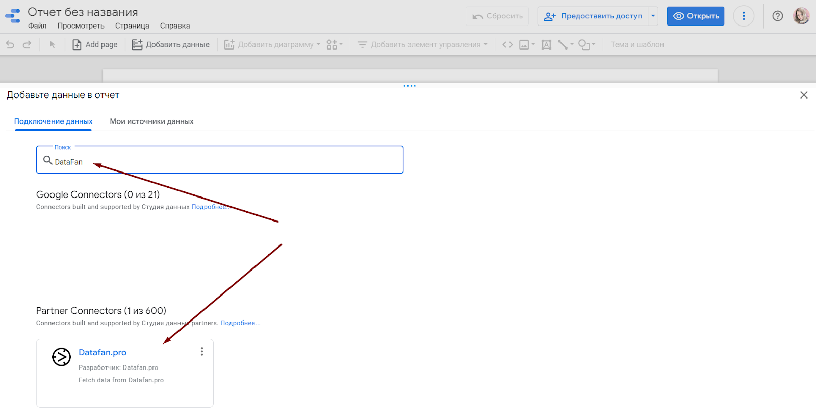 Система предложит выбрать коннектор. Для подключения сообщества ВКонтакте выберем DataFan. Найдите его в поиске и кликните.
