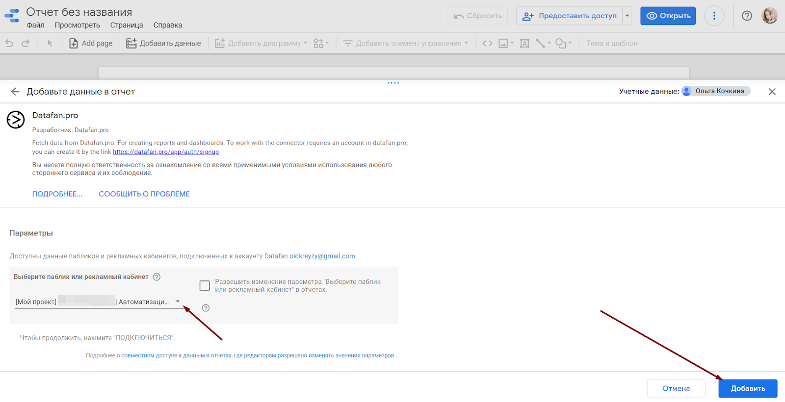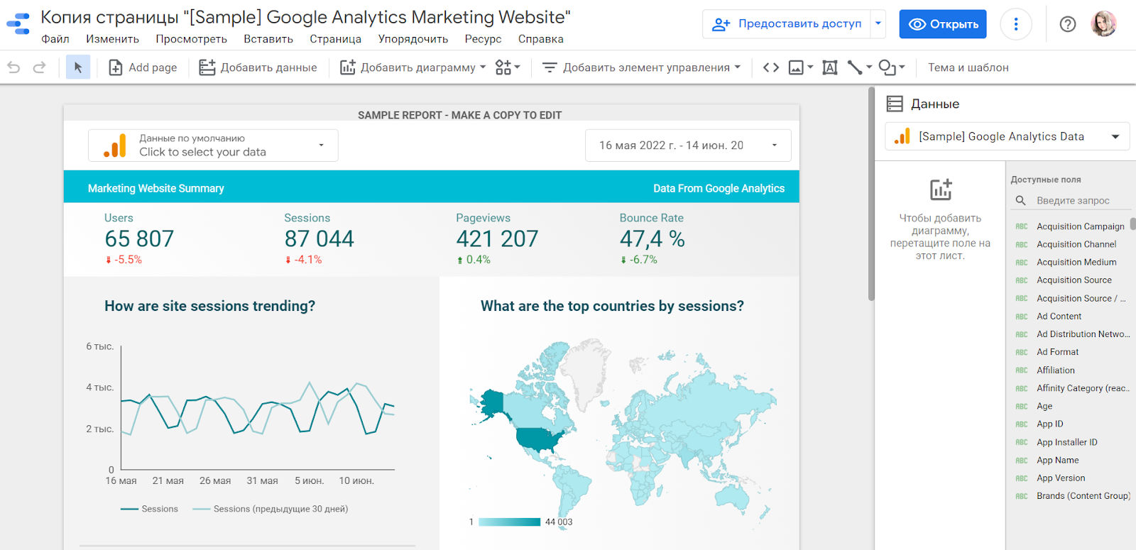 Дашборд откроется в Google Data Studio, где с ним можно будет работать дальше