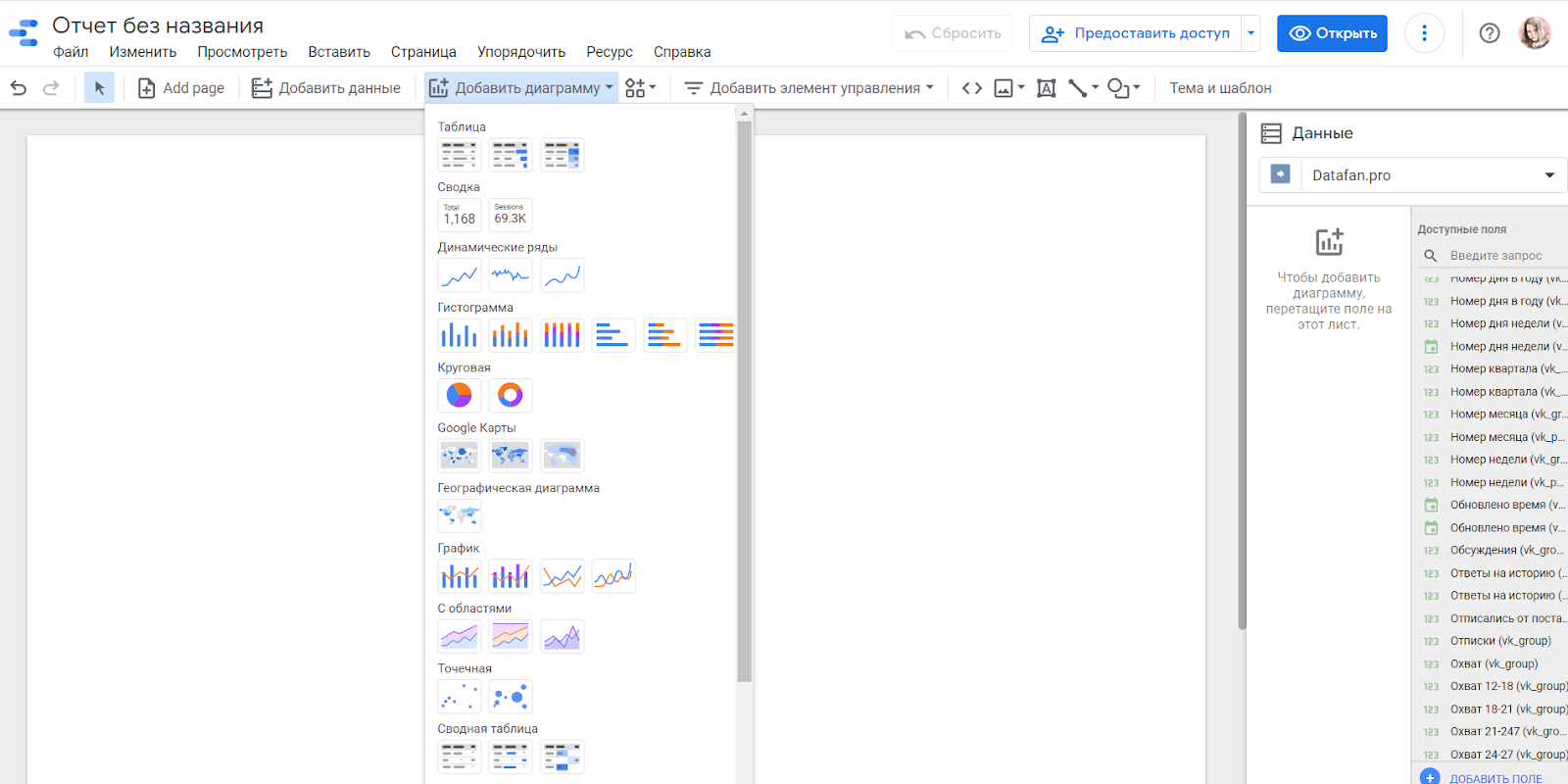 2. Подбираем элементы визуализации. В Google Data Studio десятки вариантов представления данных: маркированные и сводные таблицы, сводки, динамические ряды, графики, круговые и столбчатые диаграммы. Посмотреть все и выбрать нужную визуализацию можно через пункт “Добавить диаграмму” на панели инструментов.