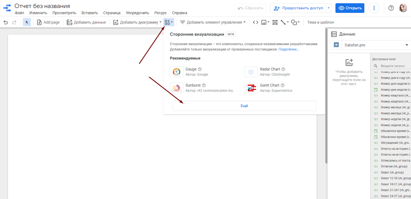 Элементы можно перетаскивать в нужное место мышкой, менять размер растягиванием. Если встроенных визуализаций не хватит, посмотрите варианты от сторонних разработчиков. Для этого откройте список кликом на иконку справа от пункта “Добавить диаграмму”.