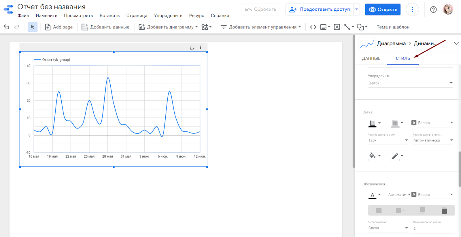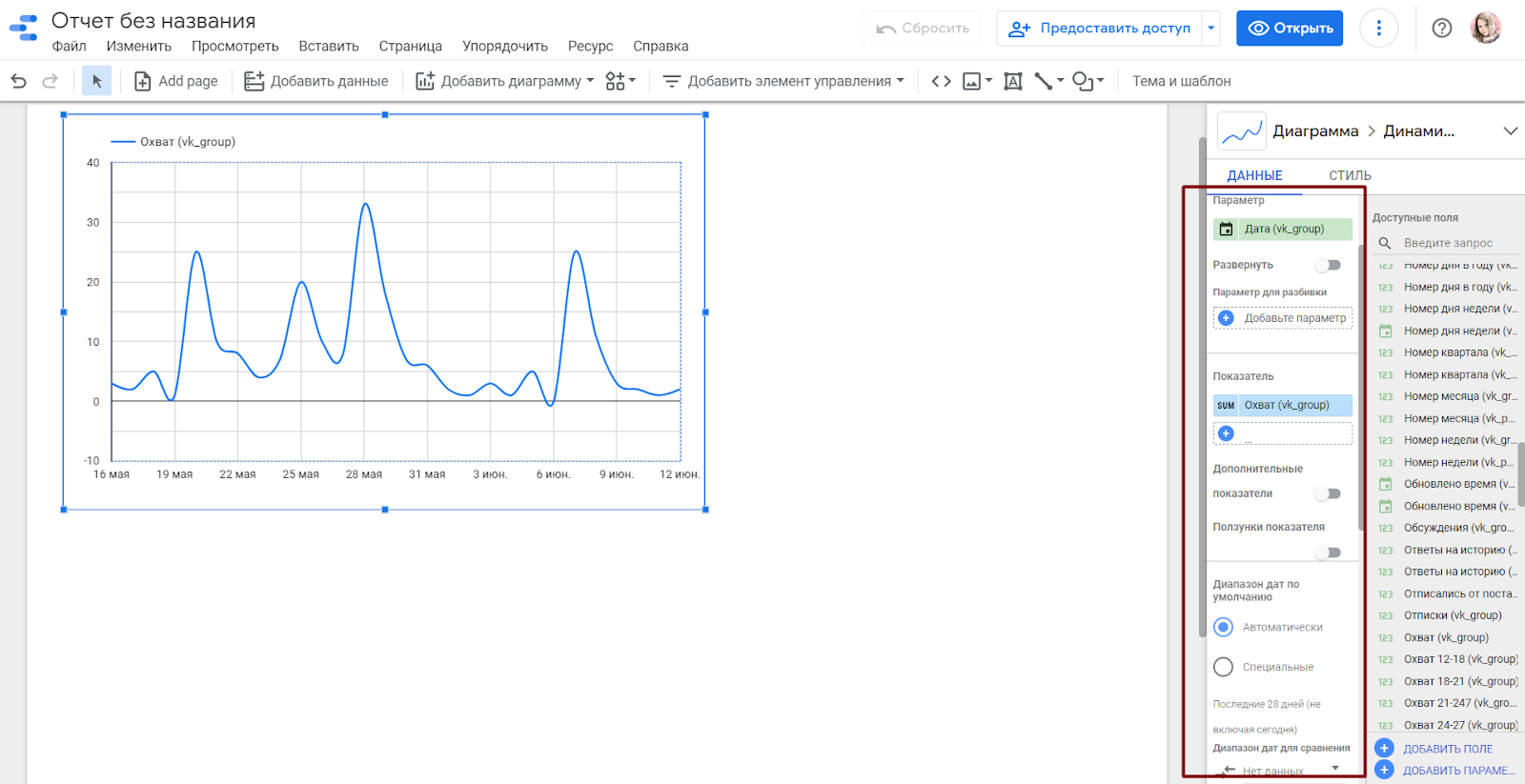 3. Настраиваем отображение данных. Для этого выберите нужный график или диаграмму кликом и задайте на панели справа параметры и показатели для отображения. Здесь же можно настроить диапазоны дат, сортировку и добавить фильтры.
