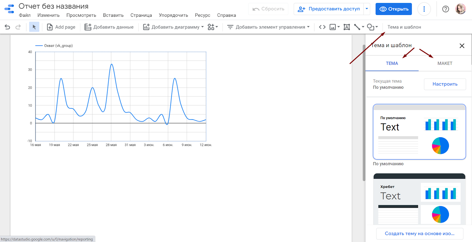 4. Оформляем дашборд. Осталось навести красоту: добавить информативные заголовки и подписи, подобрать цвета и шрифты. Если не нужен уникальный дизайн, можно выбрать общий стиль оформления. Для этого откройте раздел “Тема и шаблон” на верхней панели и выберите подходящий набор цветов и шрифтов на вкладке “Тема”.