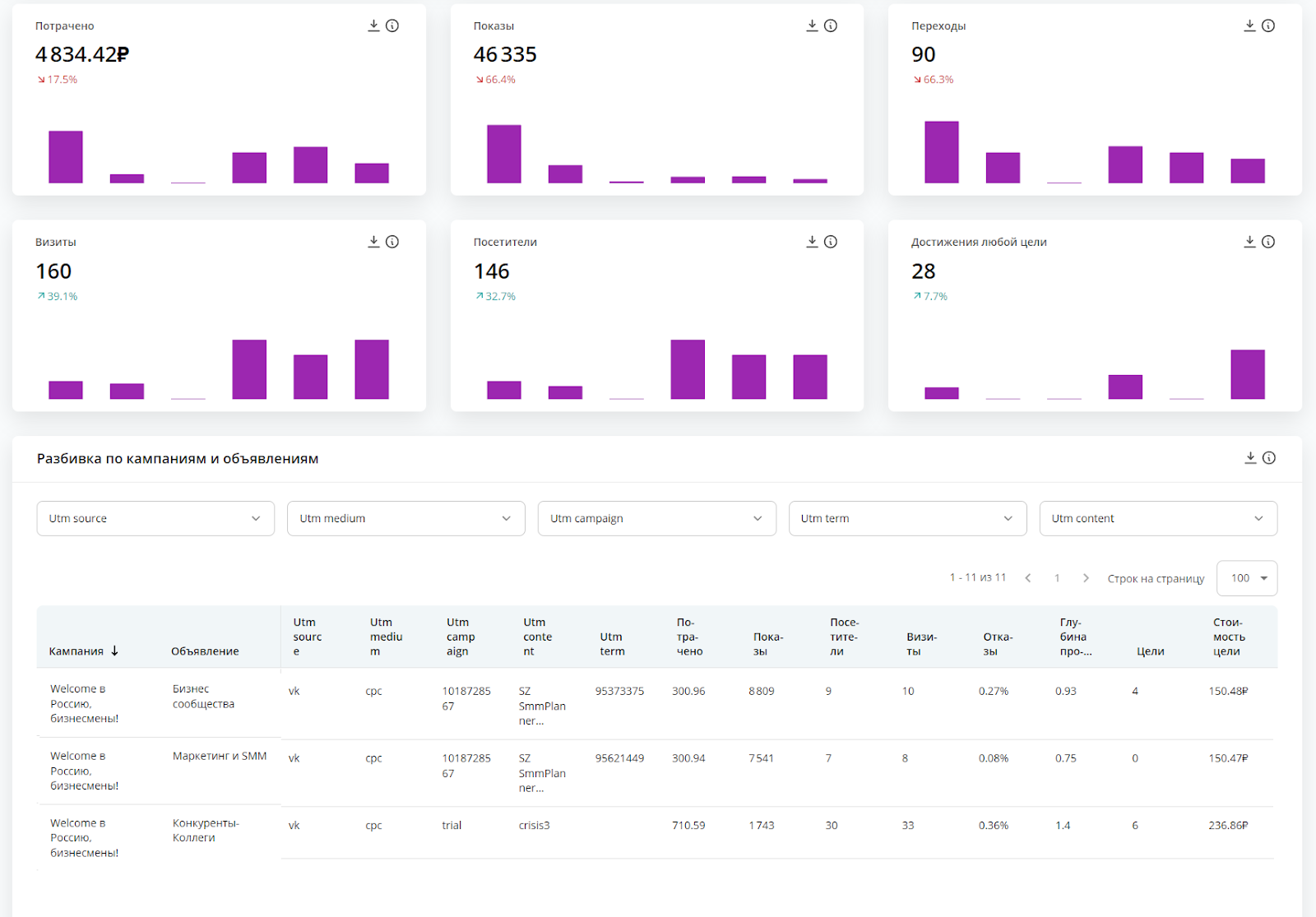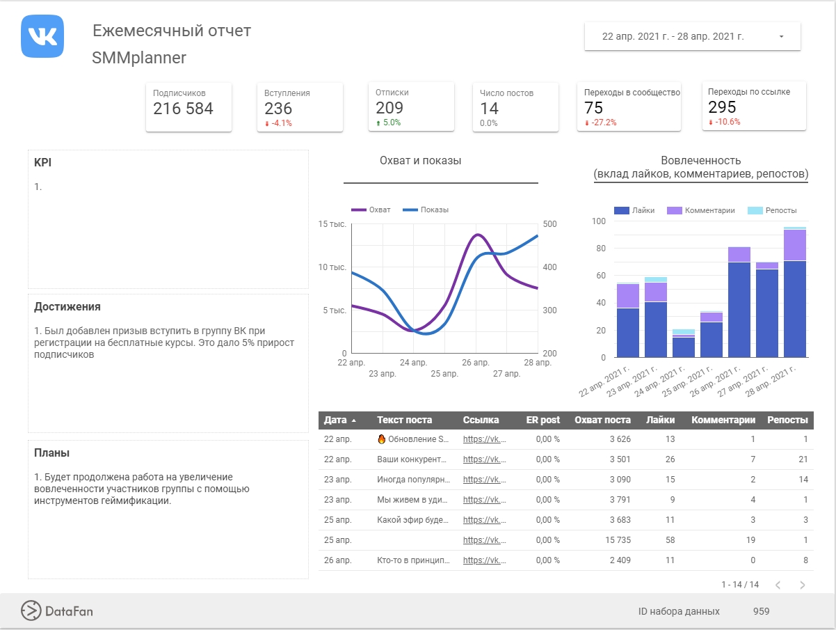 На панели, которую SMMщик использует для регулярного анализа, результатов и оптимизации данных и срезов будет больше. Ему важно не только оценивать общие результаты, но и видеть тенденции и зависимость показателей от действий.