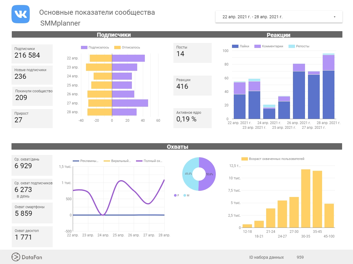 Дашборд — это интерактивная панель с данными, представленными в виде наглядных таблиц и графиков. SMM-щикам они помогают анализировать статистику групп и рекламных кампаний, делать выводы и оптимизировать работу.