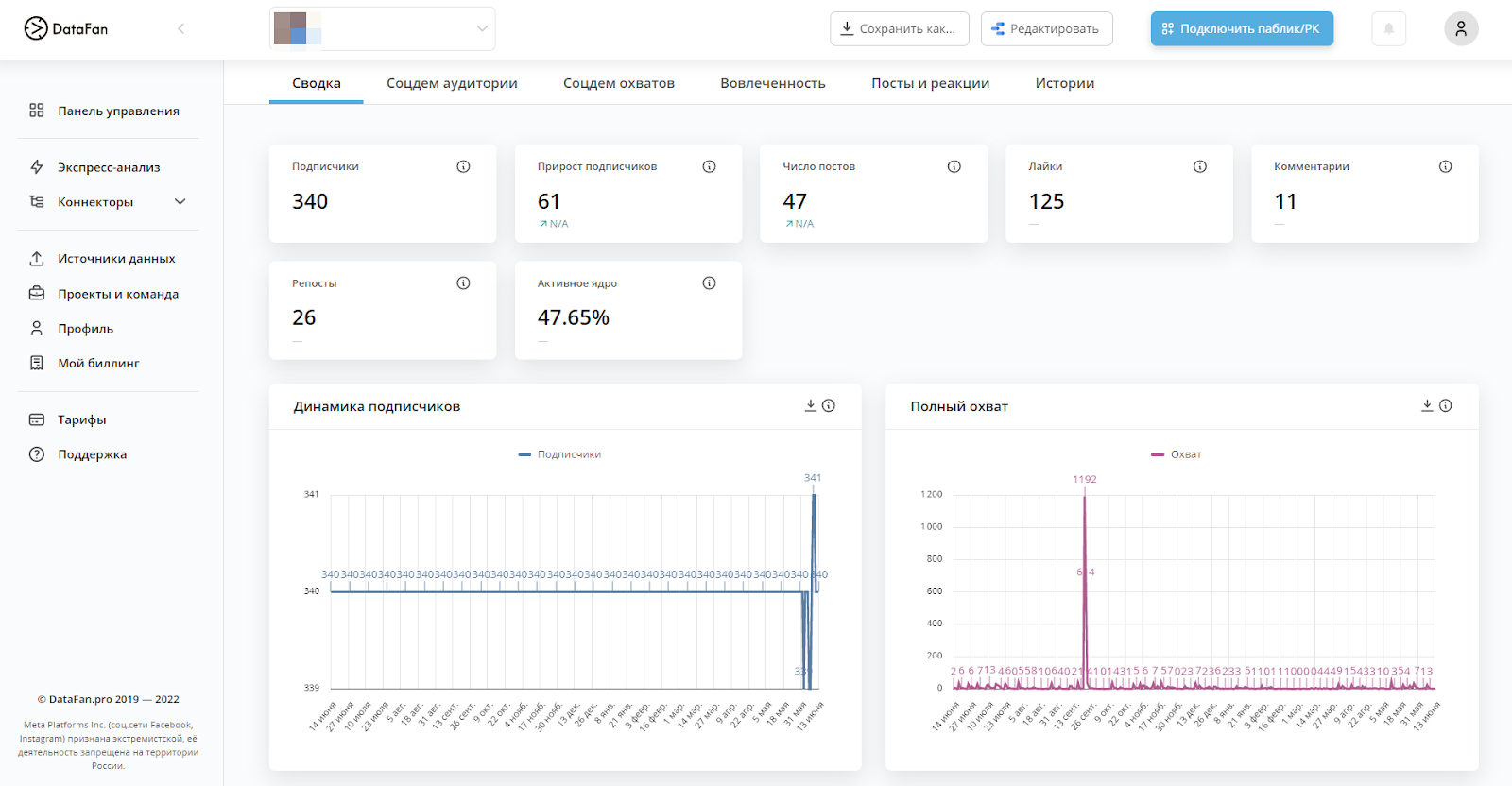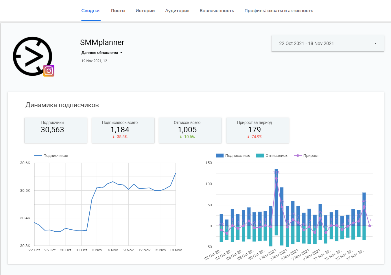 Несмотря на блокировки, жизнь в соцсети все еще есть, хоть и без таргета. Этот дашборд содержит данные по ключевым показателям развития аккаунта: количество подписчиков, вовлеченность, реакции. Есть вкладки с детализацией метрик по постам и Историям, а также данные по аудитории.