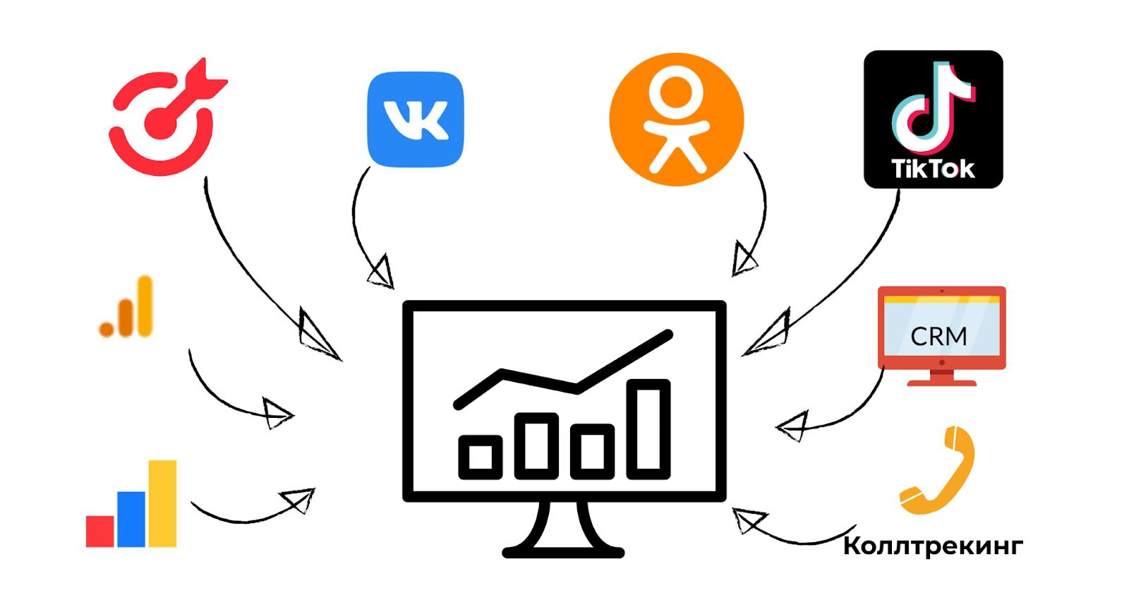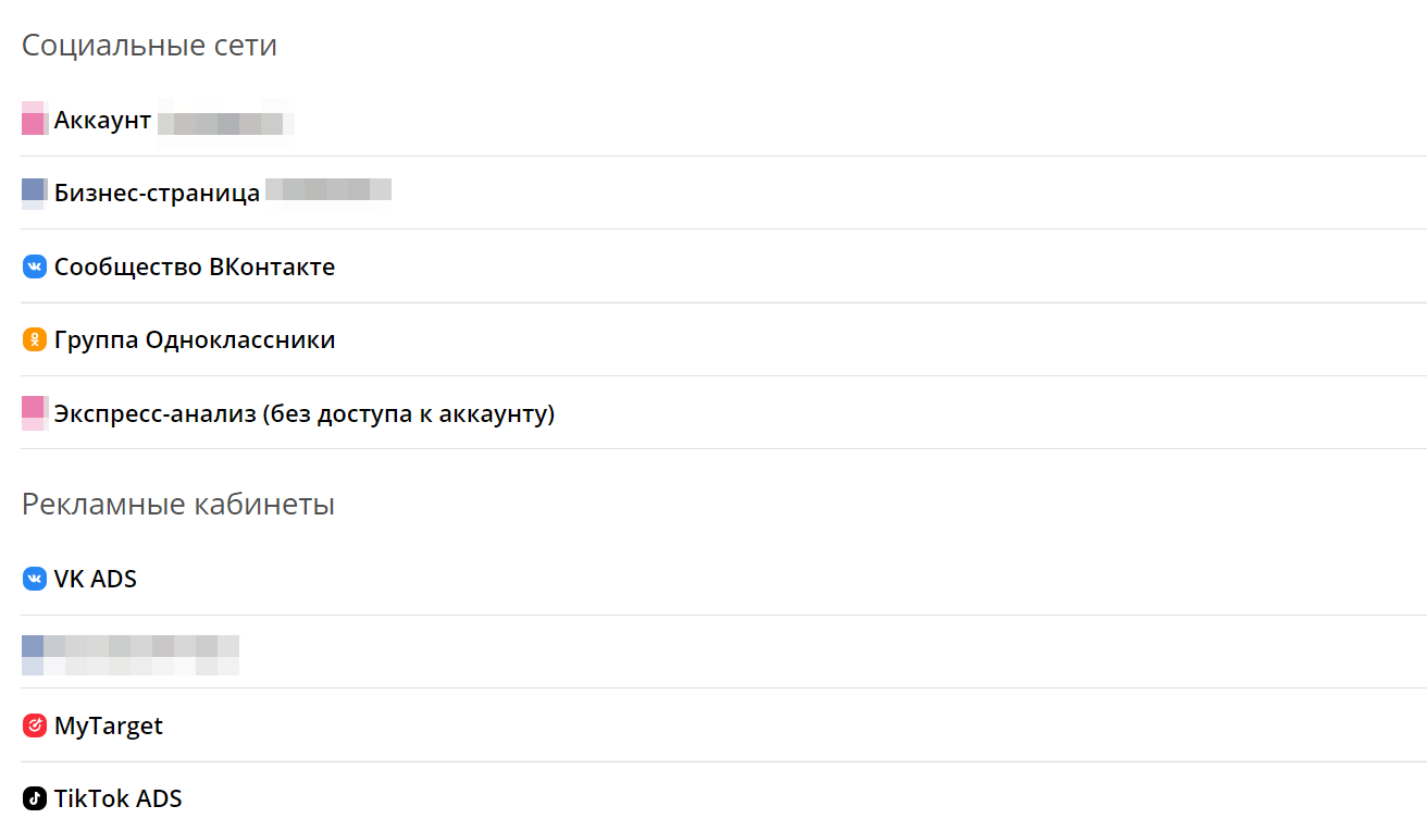 Во втором — нам нужно собрать воедино данные из нескольких рекламных кабинетов и соцсетей: сообщества и кабинета ВКонтакте, группы в Одноклассниках, myTarget, TikTok Ads.