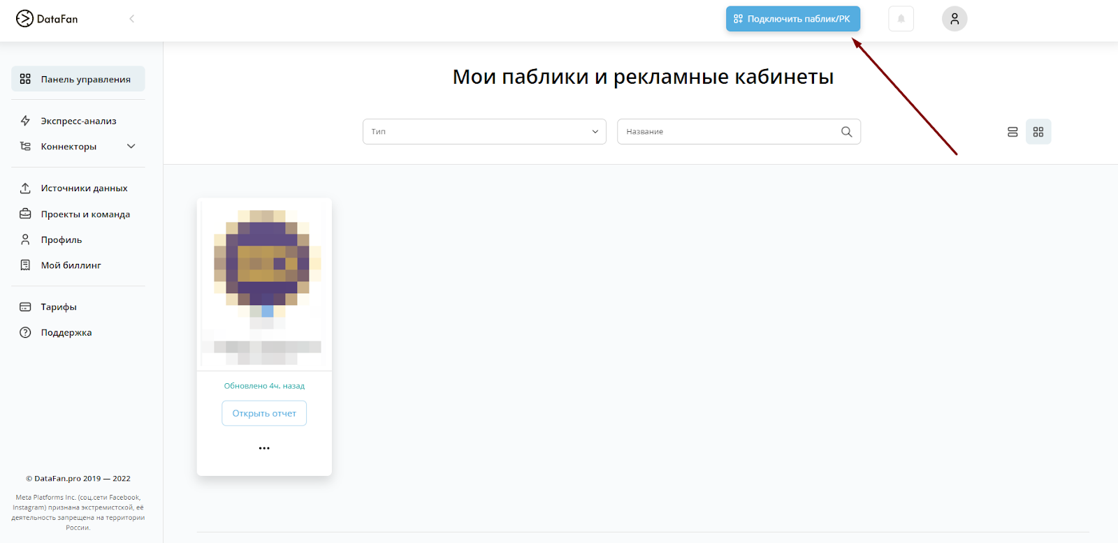 1. Авторизуйтесь или зарегистрируйтесь в сервисе и кликните “Подключить паблик / РК”.