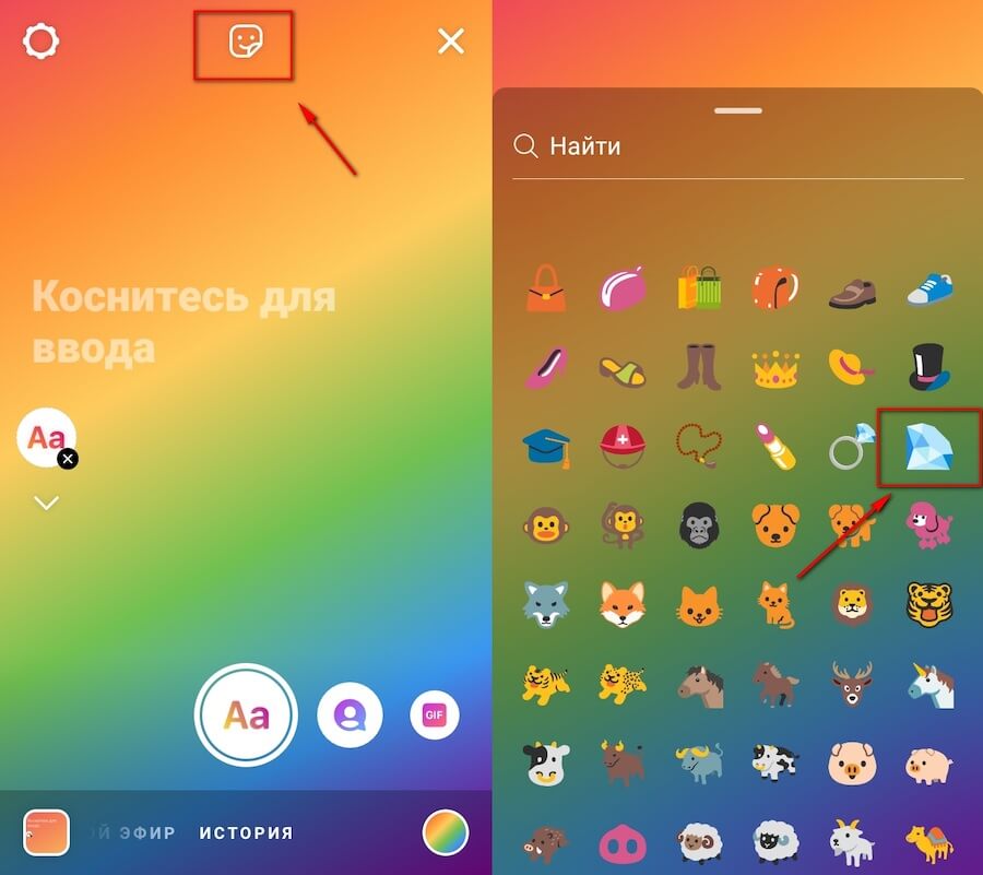 Если хочется сделать свой градиент, можно пойти на хитрость. Нажимаем на значок стикеров. Прокручиваем до эмоджи и выбираем тот, который подходит нам по цвету.
