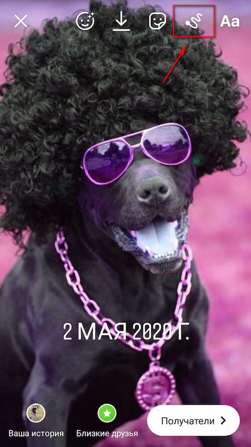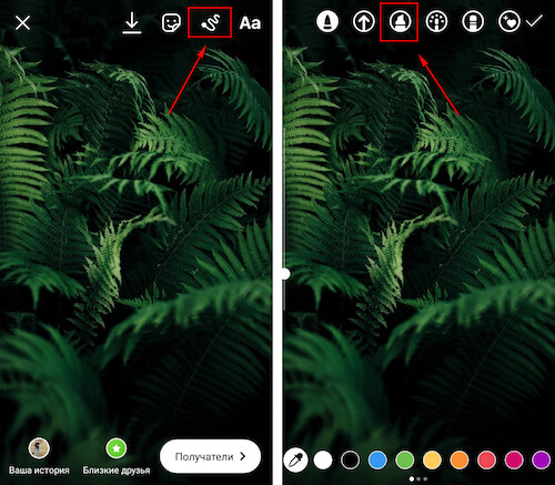 Иногда может понадобиться простой однотонный фон, например, чтобы сделать акцент на текст. Сначала нужно добавить фоном картинку из галереи (выше написано, как). После чего переходим в инструмент рисования — значок волнистой линии.