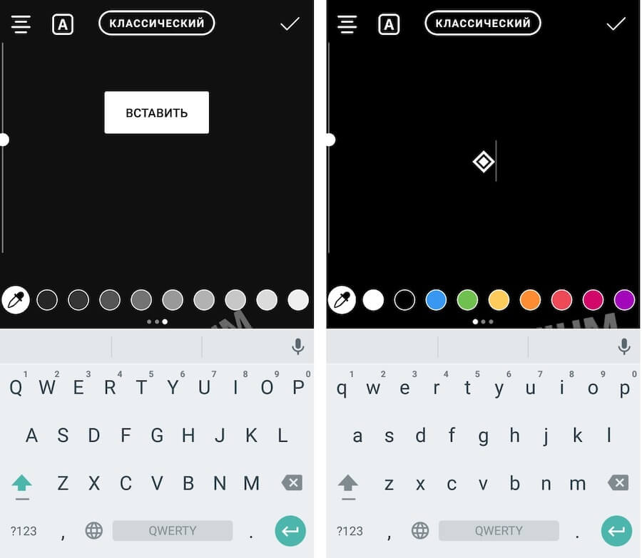 Теперь нам нужно добавить текст в сторис (все символы с этого сайта добавляем так). Нажимаем на инструмент Текст (значок с буквами Аа), зажимаем пальцем экран, чтобы появилась кнопка «Вставить», кликаем на нее и вставляем скопированный символ.