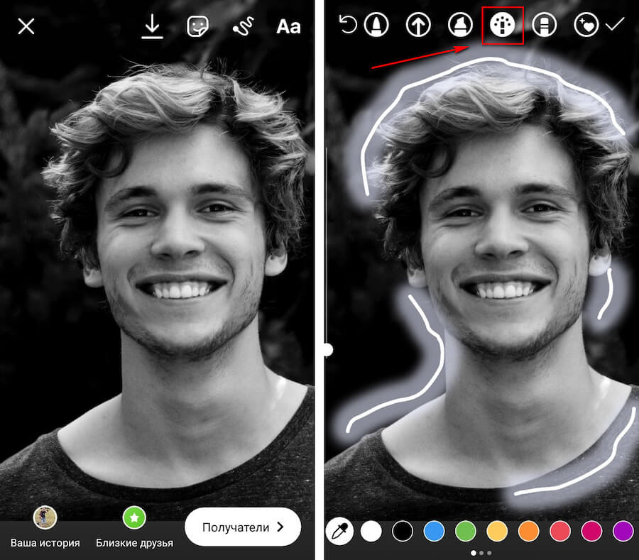 Можно сделать doodle эффект при помощи маркеров. Добавляем на фон фотографию из галереи, затем переходим в режим рисования и выбираем маркер. Можно использовать обычный или неоновый.