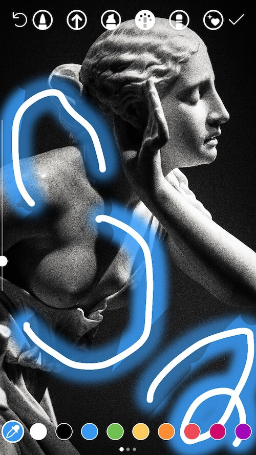 Открываем фото в галерее и рисуем любой узор. Например, витки. Можно выбрать обычный маркер, неоновый или маркер-выделитель. Неоновый смотрится эффектнее. Главное, чтобы кисть была поменьше.