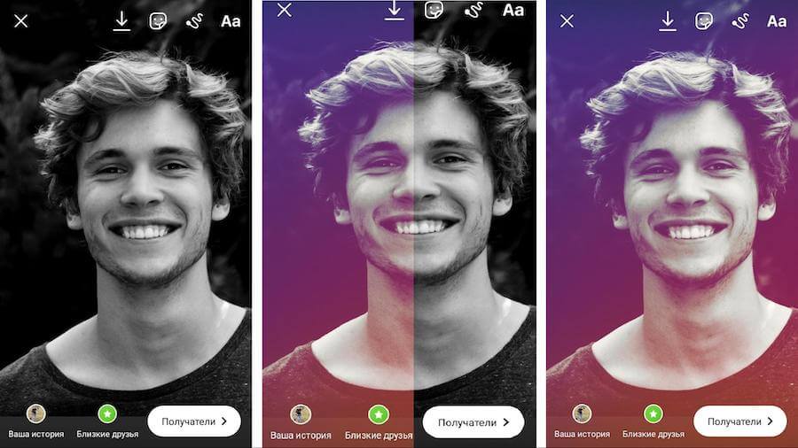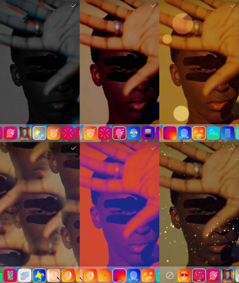 В сторис можно наложить анимированные и статичные эффекты поверх фото или видео, например, глитч эффект, мозайка, несколько лиц, duotone, боке, золотистая пыль. Эта функция явно подсмотрена у Тик-Ток.