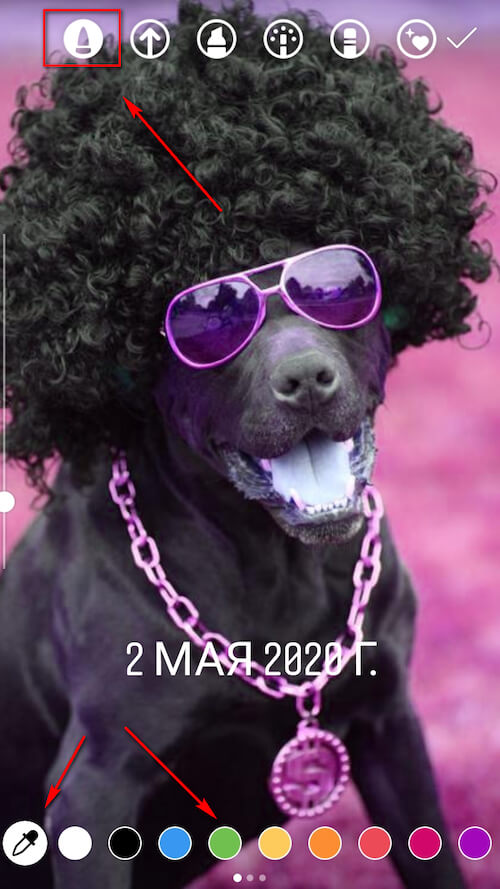 Выбираем его, внизу в палитре выбираем нужный цвет (можно использовать пипетку) и зажимаем пальцем экран, пока не появится полупрозрачная заливка.