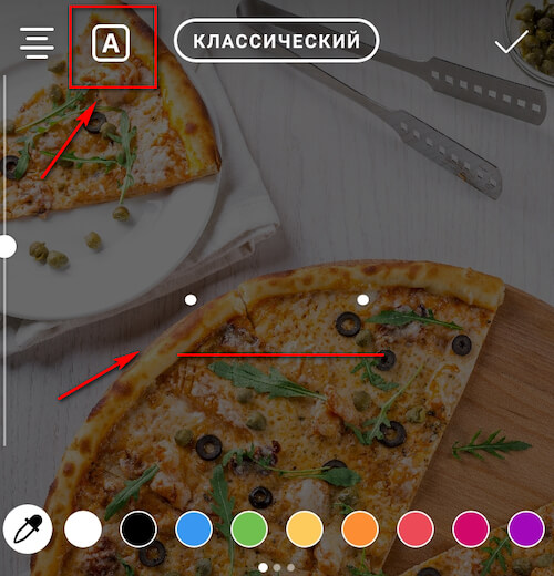 Нажимаем на иконку добавления текста. Ставим точку (можно другой знак, главное, небольшой), потом 10-15 пробелов и еще одну точку. Добавляем задний фон к тексту — значок А.