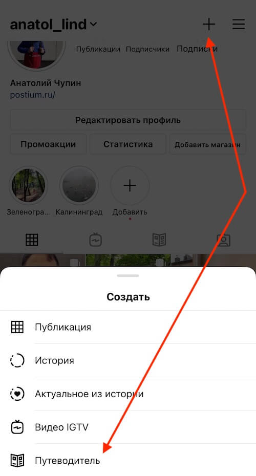 Шаг 1. Откройте главную страницу своего профиля и в правом верхнем углу нажмите на значок плюса. Внизу появится меню, где нужно выбрать «Путеводитель».
