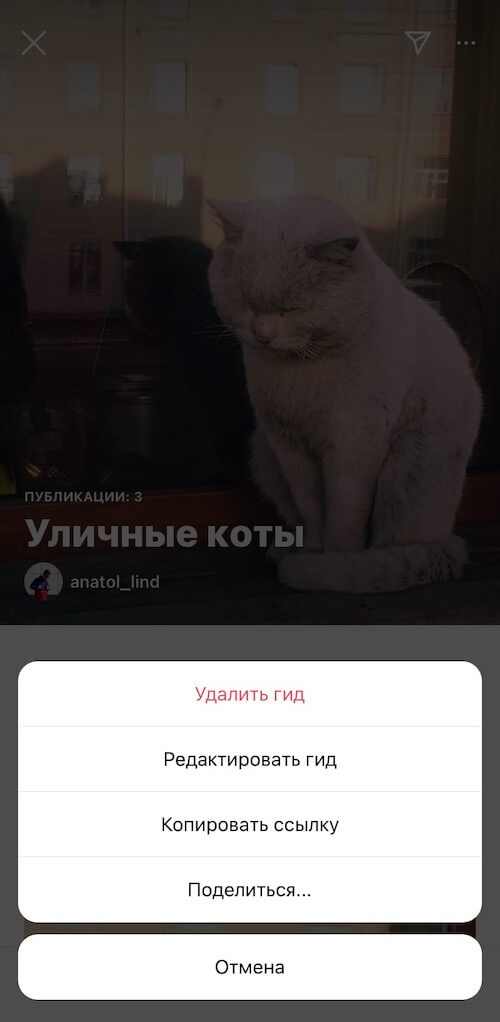 Если вы захотите отредактировать или удалить путеводитель в Инстаграм, откройте его, нажмите на 3 точки для вызова меню и выберите нужный пункт. Здесь же можно скопировать ссылку на гид или поделиться им в мессенджерах.