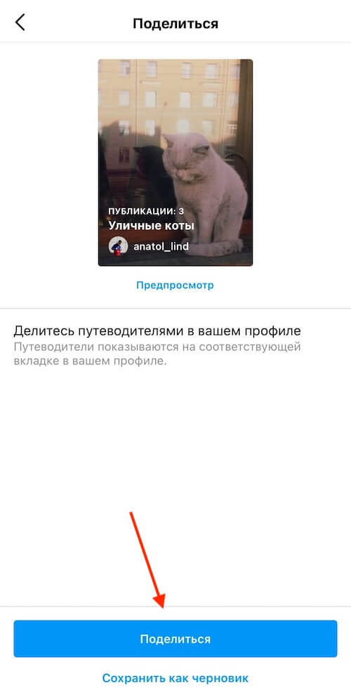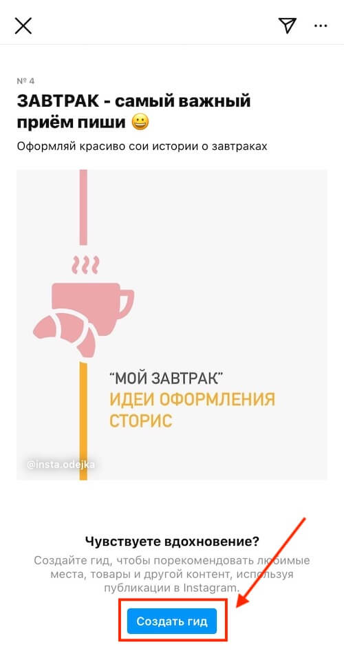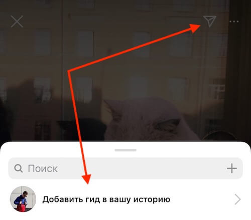 Чтобы поделиться путеводителем в сторис, сначала откройте его, а затем в верхнем правом углу нажмите на иконку отправить. Выберите «Добавить гид в вашу историю».