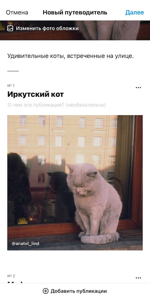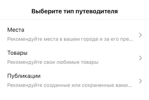 С помощью путеводителей можно объединить несколько публикаций по одной теме, сделать подборку товаров или мест, которые нужно посетить. Например поделиться маршрутом вашего путешествия.