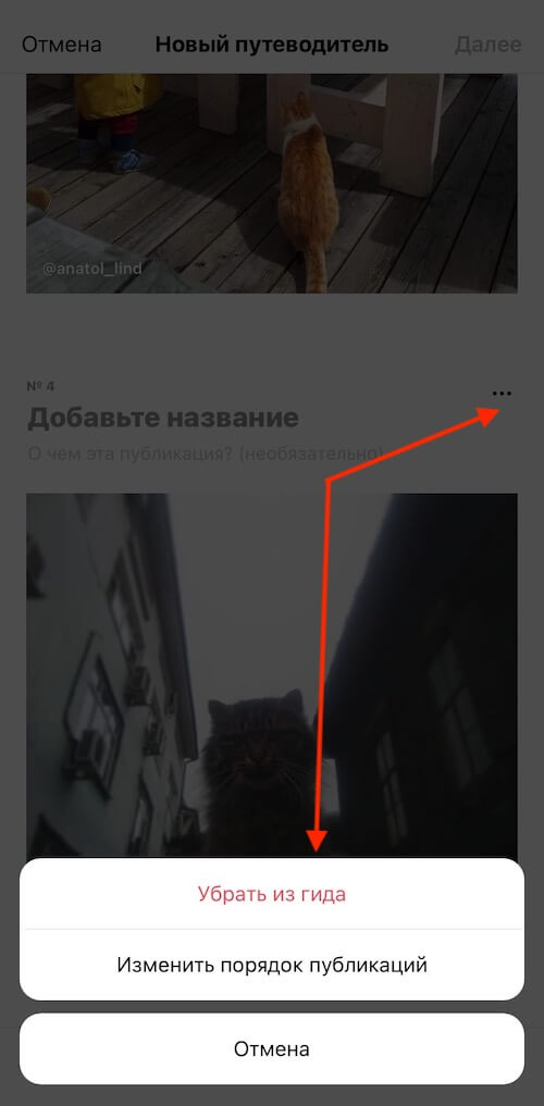 Шаг 7. Если вы хотите изменить порядок постов в путеводителе или удалить какой-то, нажмите на три точки рядом с любым постом и выберите нужный пункт. «Убрать из гида» или «Изменить порядок публикаций».