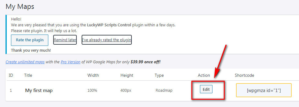 В этом плагине нужно создавать карту с нуля. Нажимаем «Создать карту» или «Create map» и создается первая карта, которой сразу присваивается шорткод — его потом нужно будет добавить в нужную часть страницы. Нажимаем «Редактировать» или «Edit».