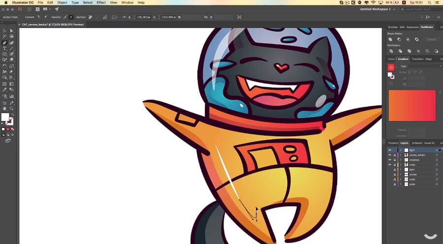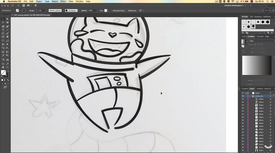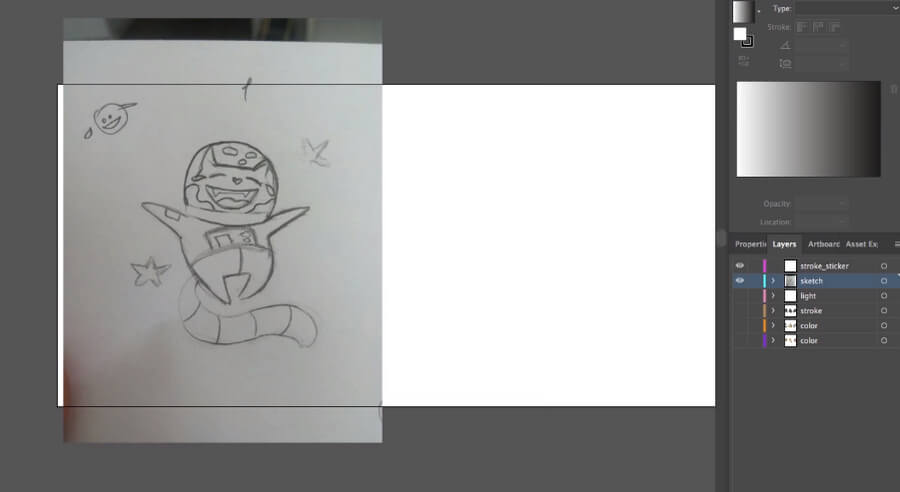 Шаг 1. Придумываем персонажа и создаем скетч. Можно нарисовать карандашом на бумаге или набросать в том же графическом редакторе. Так как в стикерпаке должно быть несколько стикеров, желательно придумать и набросать в среднем 8-10 вариантов. Можно больше. Фотографируем или сканируем рисунок и добавляем файл в Adobe Illustrator как самостоятельный слой. Делаем его более прозрачным, чтобы не отвлекал при рисовании.