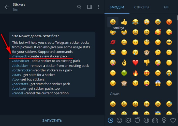 Шаг 2. Бот показывает подсказки — какая команда за что отвечает. Так как мы создаем новый пак, то используем команду /newpack.
