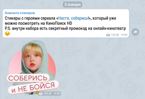 — Предлагать бонусы пользователям стикерпака. Пример — стикеры для рекламы сериала и онлайн-кинотеатра. Для привлечения внимания к стикерам предлагают искать промокод внутри стикерпака (скорее всего, был вписан в название при создании набора стикеров).