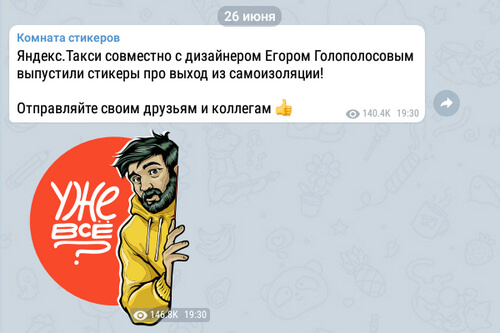 Хороший способ привлечь внимание к стикерам и добиться вирусного эффекта — использовать инфоповоды при их создании. Пример — стикеры Яндекс.Такси, посвященные выходу из самоизоляции: