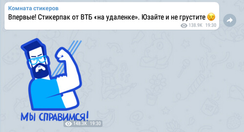 Ассоциироваться с брендом. Это отражается как в названии стикерпака, так и в самих стикерах. Это может быть, как пример, персонаж, который используется в рекламе бренда или стикер с корпоративными цветами. Пример — стикеры ВТБ в фирменных синих цветах.