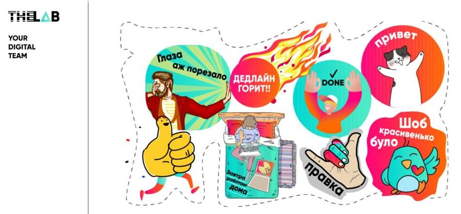 Кстати, можно создавать стикеры не только для клиентов, но и для сотрудников. Веселые наклейки разряжают обстановку в коллективе и могут стать одним из инструментов тимбилдинга. Чтобы сотрудники активнее пользовались стикерами, нужно использовать фразы, которые чаще всего звучат в коллективе. Корпоративные стикеры активно использует Digital-агентство THELAB Agency: