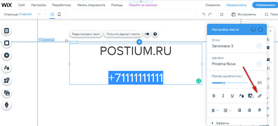 Если сайт на Wix, телефон настраивается похожим образом, с одним отличием. Когда выделяем текст и жмем на инструмент ссылки, появляется дополнительное меню, где можно выбрать, куда ведет ссылка.