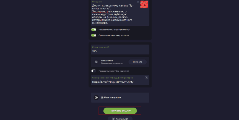 Шаг 2. Кликните на кнопку “Получить ссылку”. Скопируйте ссылку с открывшейся странице (оттуда же можно взять QR-код) и поделитесь с подписчиками в основном канале.
