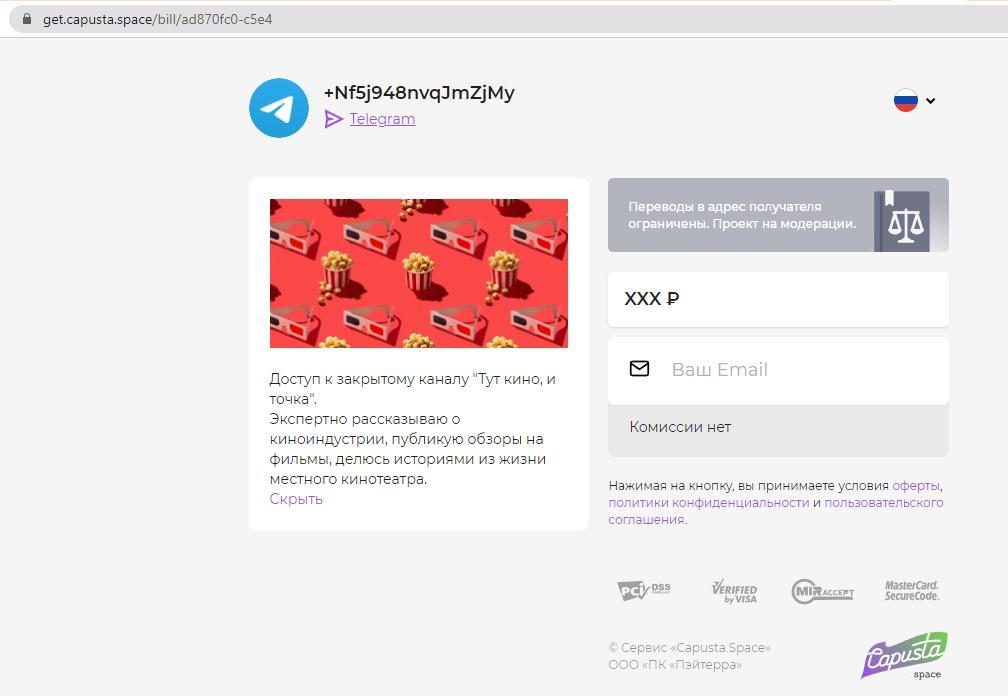 Шаг 3. При переходе по ссылке откроется вот такая страница оплаты. У моего проекта статус “На модерации”, поэтому и сумма платежа превратилась в XXX рублей. Чтобы пройти модерацию, информативно заполните описание своего канала как внутри Телеграма, так и при создании подписки.